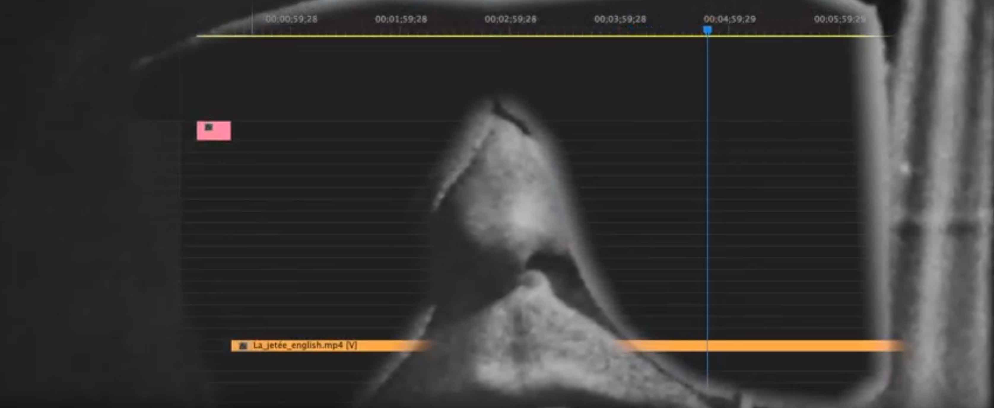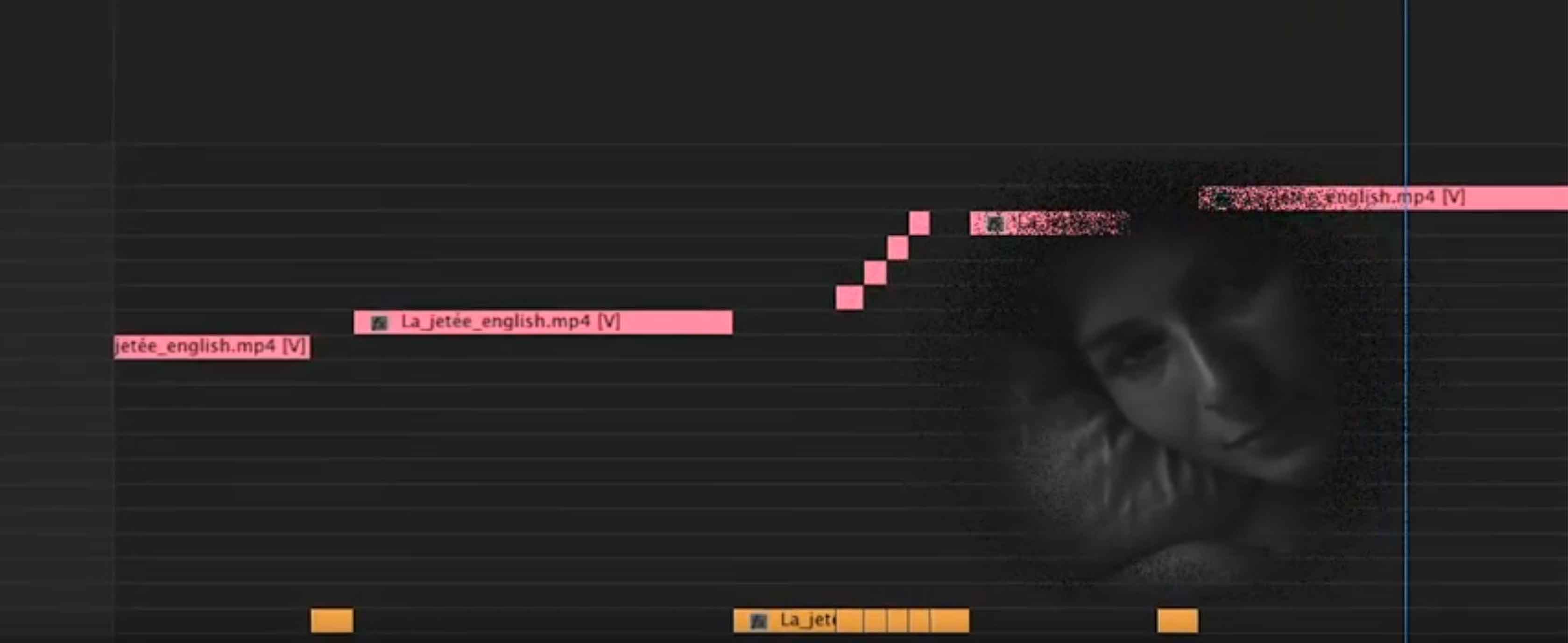Aus Fragmenten des Photo-Romans La Jetée (1962) von Chris Marker ergibt sich eine neu verortete Zeitbetrachtung als essayistischer Experimentalfilm. Die dramaturgische Struktur wird abstrakt elliptisch interpretiert und assoziativ remontiert. Die Arbeit stellt dabei die Aspekte der Zeitwahrnehmung des Films, der sich in verschiedene Ebenen gliedert, heraus und präsentiert diese grafisch auf dem digitalen Schneidetisch.